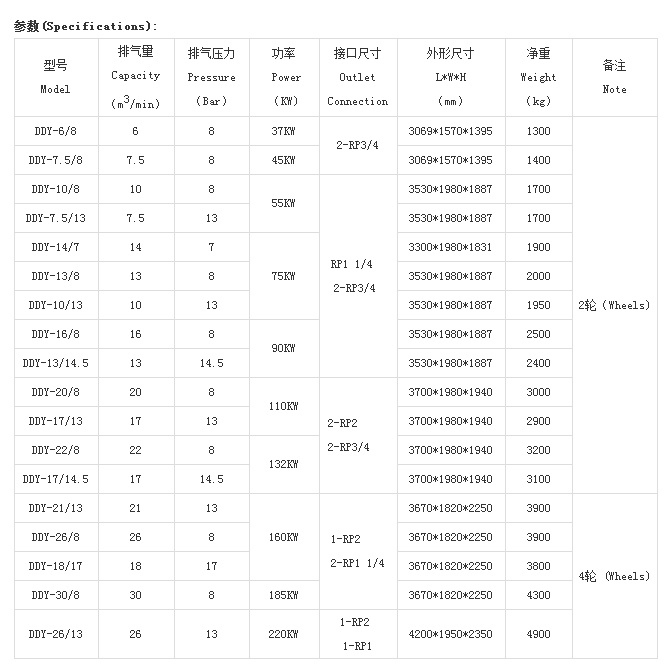 DDY 系列電動移動螺桿式空氣壓縮機技術參數