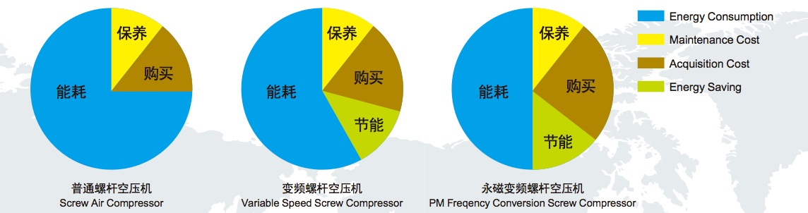 例如一臺(tái)22kw的螺桿機(jī),普通空壓機(jī)的電機(jī)效率在88%  90%不等。永磁同步電機(jī)的效率在94%以上。同樣22kw的空壓機(jī),普通電機(jī)滿載時(shí)耗電為25kw  24.4kw, 而永磁同步電機(jī)的能耗為23.4kw。一小時(shí)永磁電機(jī)就能節(jié)約1.6kw的電。